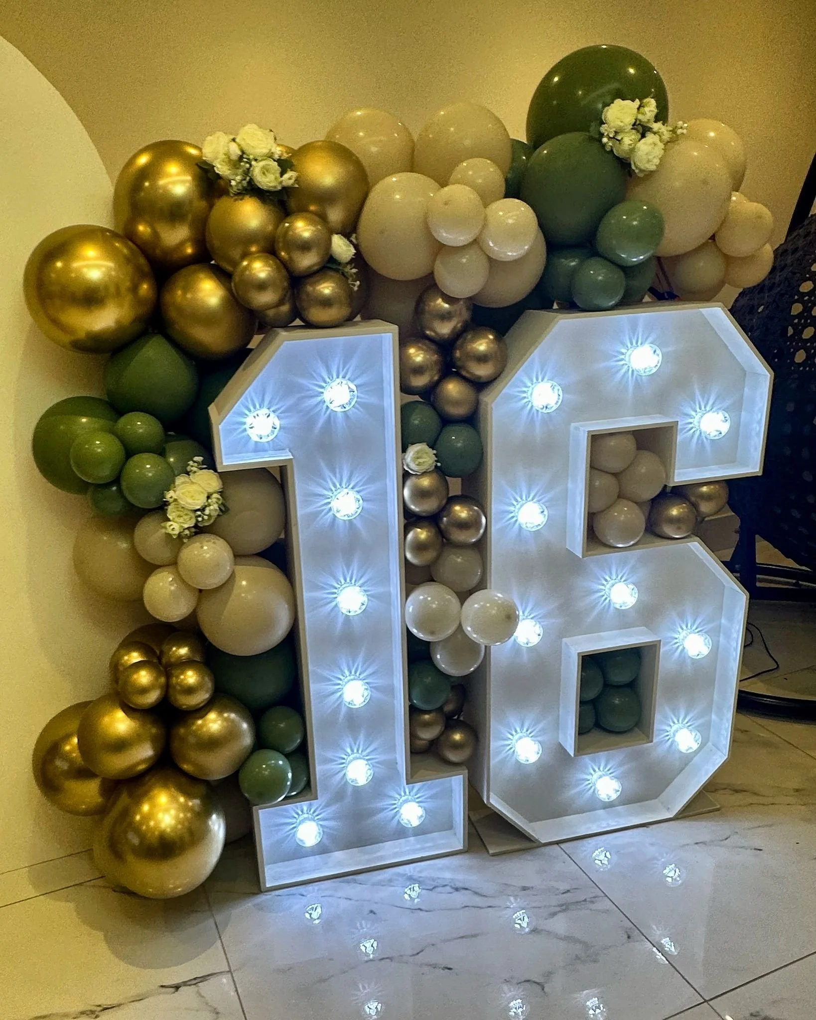 Rent big LED numbers to create a stunning visual statement that will captivate your guests, or consider crafting a beautifully designed custom balloon and number setup that is specifically tailored to enhance and reflect the unique theme of your special event.